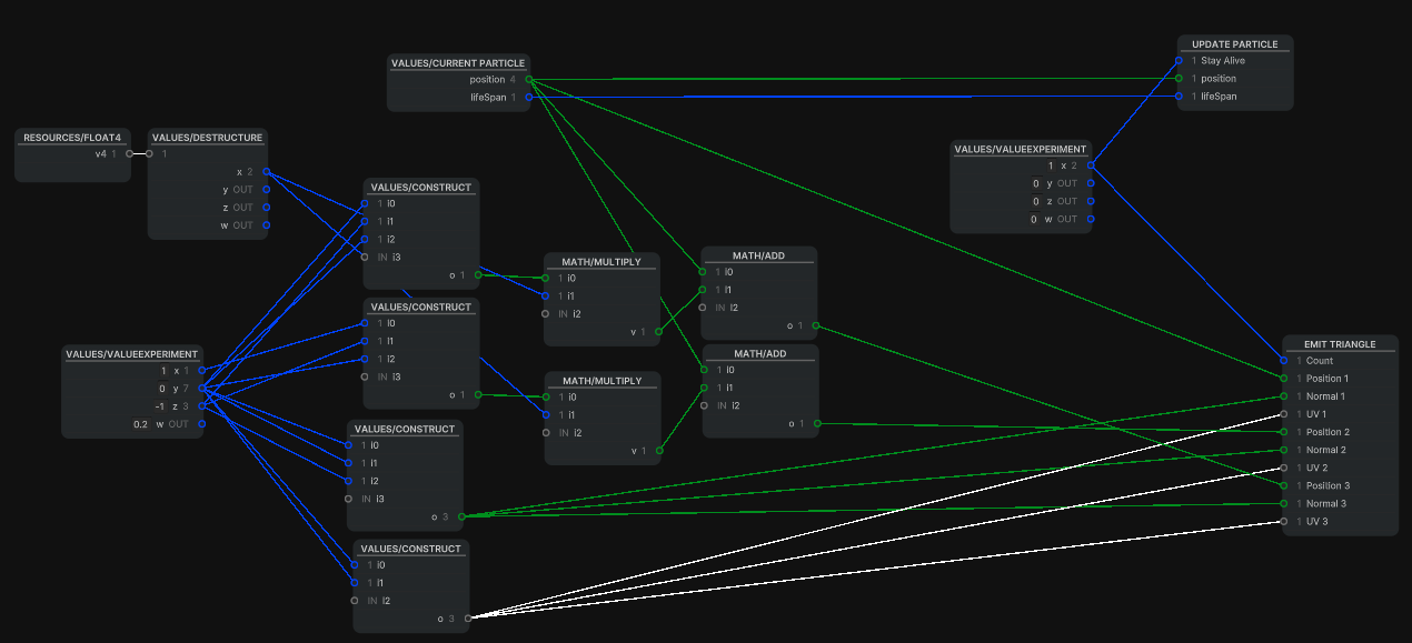 Our artists will need to be able to script the particles’ behavior, so we’ve gone down the very tried-and-true route of having them make these scripts via a node graph.